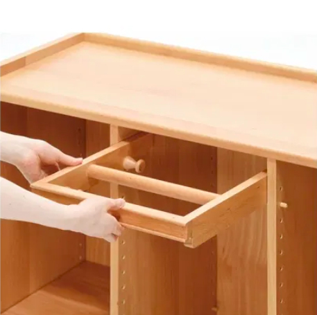 ネジは、必要最小限の数(4箇所)。パーツは組み合わせ自由、棚などのオプションも追加可能。子どもたちの人数や荷物に合わせ、自由にカスタマイズできます。
