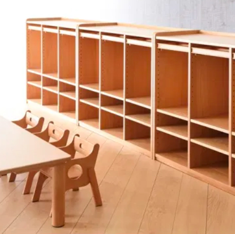 ネジは、必要最小限の数(4箇所)。パーツは組み合わせ自由、棚などのオプションも追加可能。子どもたちの人数や荷物に合わせ、自由にカスタマイズできます。
